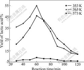 In order to find the best condition for preparation of lactic acid, three samples were chosen to evaluate the influence of reaction time. The reactions were carried out in a stainless steel bath. The amount of glucose was fixed at 0.400 g, that of calcium hydroxide was 0.150 g and that of the ionic liquid C22H43ClN2 was 1.000 g. Because the melting point for the ionic liquid is about 353 K the samples covered the range from 353 to 373 K. Fig.1 shows that the sample reacted at 353 K has obviously different results compared with results of other samples. The yield of lactic acid is near 5% at first, and as reaction time increases, it does not show a distinct improvement. After 60 min, the yield still preserves at near 5% and keeps at this value for further increment of time. For the experiments at 363 K and 373 K, the lactic acid yields initially increase until 60 min and then decrease for subsequent rise in time. Both of these data show reaction time of 60 min is an advantageous time for obtaining a high yield of lactic acid. The highest yield at 363 K for 60 min is about 55%, which is larger than 45% at 373 K.