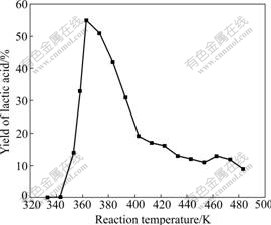 Fig.2 Influence of reaction temperature on yield of lactic acid (Reaction condition: 0.400 g glucose, 60 min, calcium hydroxide as catalyst, [OMIM]Cl as reaction solvent)