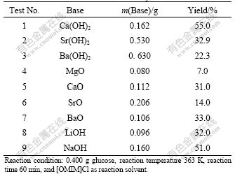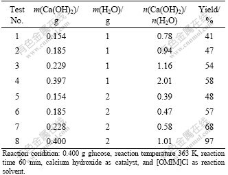 (2) The optimal reaction conditions are as follows: 0.400 g calcium hydroxide, 0.400 g glucose in 2.000 g hydrophobic ionic liquid ([OMIM]Cl) reaction temperature 363 K, and reaction time 60 min, and the yield reaches about 100%.