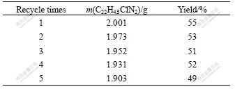 As the investigations above mentioned, a series of conditions were explored, but the most important for these reactive systems is the recycle capability of hydrophobic ionic liquids. C22H43ClN2 is evaluated. The result shows that it is available for the production of lactic acid. So it is chosen as solvent for the recycle test. The results are shown in Table 4. Every test was carried out in the same reactive conditions: 0.400 g glucose, 0.150 g calcium hydroxide, and 363 K for 60 min. After reaction, water was used for three times to extract calcium lactate and other products that can solve in water, and hydrochloric acid was used to wash calcium hydroxide that is insoluble in water. The remnant solid is the ionic liquid and is heated at 393 K for 12 h to evaporate water. Table 4 demonstrates that the yield of lactic acid can keep at a stable level, the loss is less than 5% based on mass for every time in this recycle program. After all, ionic liquid essentially has a surfactant structure and a certain water solubility.