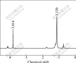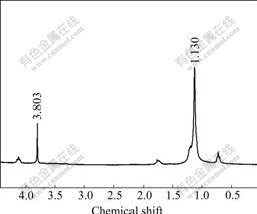 Fig.3 shows 1H NMR spectrum the fresh ionic- liquid. Fig.4 shows 1H NMR spectrum of the products washed by de-ionic water three times. This process was used to extract lactate and glucose which both could solve in water. Because the decomposition products of C22H43ClN2 have a long carbon chain that is unsolvable in water, they can form new peaks in 1H NMR spectrum. Fig.3 and Fig.4 have peaks that belong to ionic liquid chemical shift of 1.130. After reaction, they do not form any new peaks, indicating that the ionic liquid is not involved in the reaction of glucose with base. It is only used as solvent to prompt the reaction and kept as original formation during reaction process.