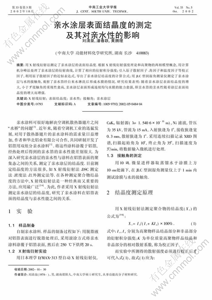 亲水涂层表面结晶度的测定及其对亲水性的影响