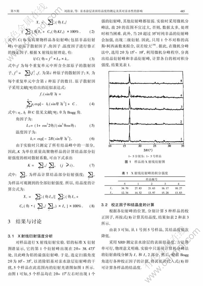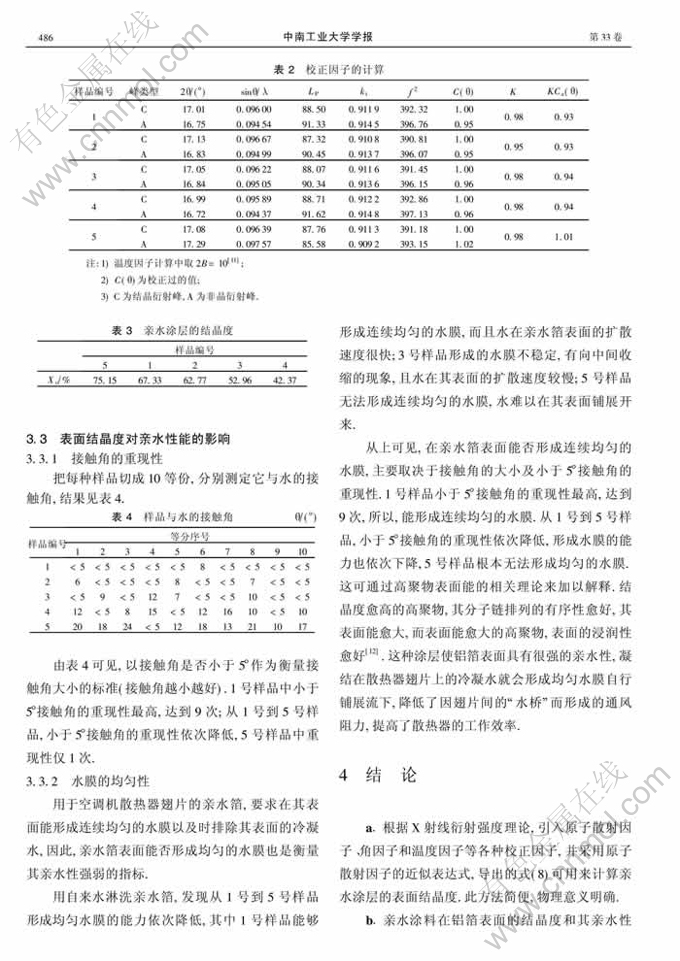 摘 要:用X射线衍射法测定了亲水涂层的表面结晶度.根据X射线衍射强度理论和高聚物的两相模型概念,用计算机分峰法处理了亲水涂层的衍射曲线,计算了相应的衍射积分强度;引入原子散射因子、角因子和温度因子等校正因子,利用原子散射因子的近似表达式,导出了亲水涂层结晶度的计算公式;用JLC型润湿角测量仪测定了亲水涂层与水的接触角,观察了亲水箔经自来水淋洗后形成水膜的情况.研究结果表明:随着亲水涂层表面结晶度的增大,小于5°接触角的重现性愈高,亲水涂层表面形成连续均匀水膜的能力愈强,即亲水箔的亲水性随着涂层表面结晶度的增大而增强.