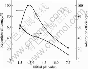 Fig.4 Effects of initial pH values on photocatalytic reduction efficiency and adsorption efficiency of Cr(Ⅵ) in Cr(Ⅵ)-CA- FN system