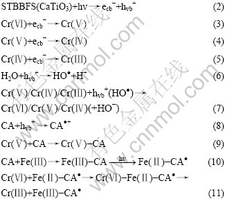 3) 存在CA和Fe(Ⅲ)时,降低了吸附对Cr(Ⅵ)光催化还原率的影响,且能有效地抑制电子?空穴对的复合,促进光生电子还原Cr(Ⅵ)离子。