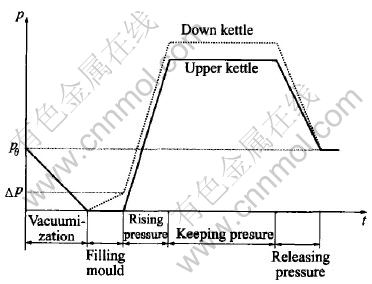 Working theory of vacuum counter-pressure casting is shown in Fig.1. Its technology is divided into five stages: vacuumization, filling mould, rising pressure, keeping pressure and releasing pressure. Its technical route is shown in Fig.2.