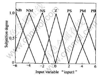By utilizing Fuzzy Toolbox of MATLAB, reasoning systems of vacuum counter-pressure casting fuzzy control are designed. The reasoning systems are a kind of construction of double inputs and single output, in which double input variables include fuzzy error(E) and fuzzy error variable(EC), and single output variable is fuzzy control variable(U)[ 16, 17]. Supposing all fuzzy control field of E, EC and U are -6-+6, they are described with seven kinds of different fuzzy language variables such as Negative-Big(NB), Negative-Middle(NM), Negative-Small(NS), Zero(Z), Positive-Small(PS), Positive-Middle(PM) and Positive-Big(PB). Subjection functions of fuzzy language variables corresponding to fuzzy error E, EC and control variable U are designed with MATLAB, and they are shown in Fig.3.