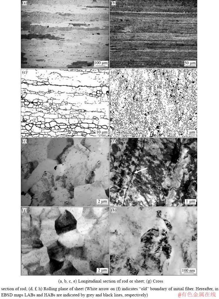 Fig. 1 OM (a, b), SEM-EBSD (c, d) and TEM (e-h) images of 2024 aluminum alloy in pre-quenched hot-pressed rod (a, c, e, g) and further cryorolled sheet (CR+NA) (b, d, f, h)