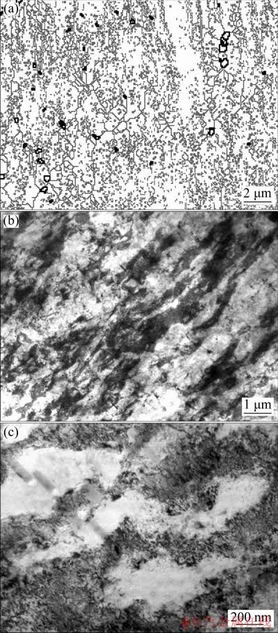 Fig. 2 SEM-EBSD (a) and TEM (b, c) images of 2024 aluminum alloy cryorolled and artificially aged at 100 °C for 12 h