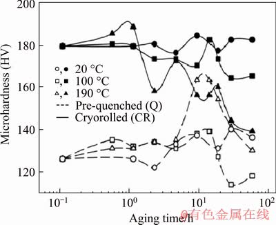 Fig. 3 Microhardness evolution in pre-quenched rod (Q) and further cryorolled (CR) 2024 aluminum alloy under aging at different temperatures