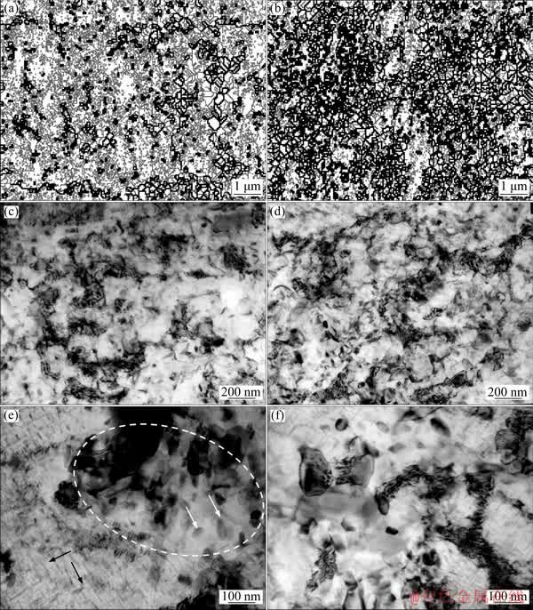 Fig. 4 SEM-EBSD (a, b) and TEM (c-f) images of cryorolled 2024 aluminum alloy after artificial aging at 190 °C for 12 h (a, c, e) and 48 h (b, d, f) (White circle indicates area with recrystallized nano-(sub)grain structure, black and white arrows-needle(disc)-like and compact S-phase precipitates, respectively)