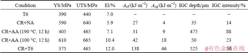 The measurements have revealed that the IGC in the cryorolled and naturally aged alloy, unlike the initial naturally aged state, occurred with higher intensity and to higher depth (Fig. 8). At that time, the absolute values of these changes were not so high. The less corrosion resistance was found in the artificially aged conditions. The CR and conventionally artificially aged alloy has the worst corrosion resistance among the investigated ones. This means that cryorolling intensified the alloy corrosion by 1.7 times resulted in practically whole contact surface damage (Figs. 6-8) [12]. Meanwhile, the depth of its corrosion spots was a bit lower than that in the non-rolled T6-tempered rod. However, the behavior of the cryorolled and artificially aged alloy could be considerably improved, if the aging conditions were changed (Figs. 6(c) and (d)). Thus, the aging of the CR alloy treated at 100 °C for 12 h led to quite sensitive improvement of both IGC resistance parameters (Fig. 8) [12].