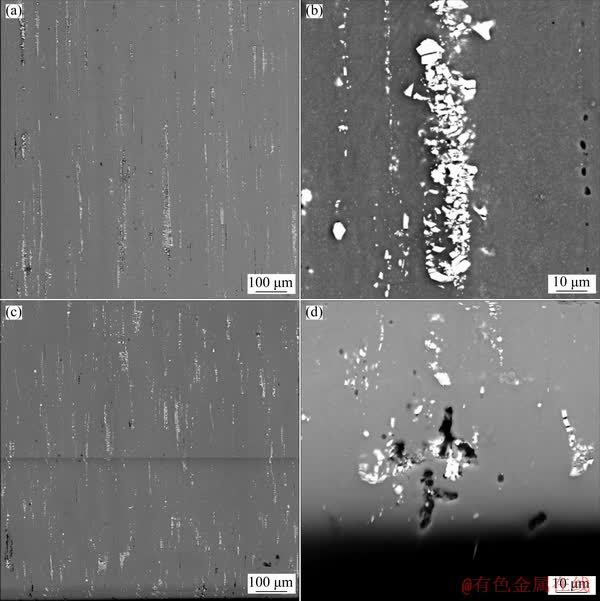 Fig. 7 Morphologies of 2024 aluminum alloy intergranular corrosion in pre-quenched and artificially aged (T6) hot-pressed rod (a, b) and cryorolled and artificially aged at 190 °C for 12 h (c, d) conditions