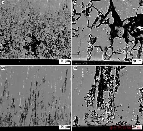 Fig. 6 Morphologies of 2024 aluminum alloy intergranular corrosion in cryorolled and naturally aged (a, b) and cryorolled and artificially aged at 100 °C for 12 h (c, d) conditions