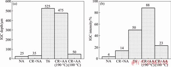 Fig. 8 2024 alloy intergranular corrosion depth (a) and intensity (b) in naturally and artificially aged initial hot-pressed rod and cryorolled sheet