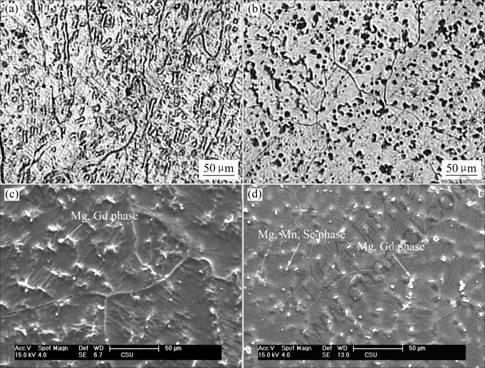 The microstructures of the studied alloys are shown in Fig.1. The grains of MgGd alloy are coarse, and there are a lot of coarse second phase particles which contain Mg and Gd (Fig.1(a), (c)). The MgGdScMn alloy consists of α-Mg matrix and some dis-continuous cluster, and the grain boundary can be clearly seen (Fig.1 (b), (d)). The results of EDS demonstrate that there are two kinds of second phase in MgGdScMn alloy: one is the skeleton-like phase containing Mg and Gd, the other is the second phase particle containing Mg, Sc and Mn (Fig.1 (d)).