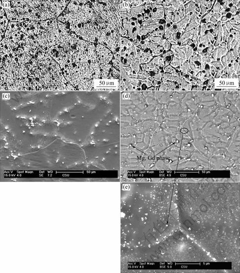 Fig.2 OM and SEM images of homogenized alloys of Mg-12.4Gd and Mg-12.5Gd-0.78Sc-1.4Mn: (a), (c) Mg- 12.4Gd; (b), (d), (e) Mg-12.5Gd-0.78Sc- 1.4Mn