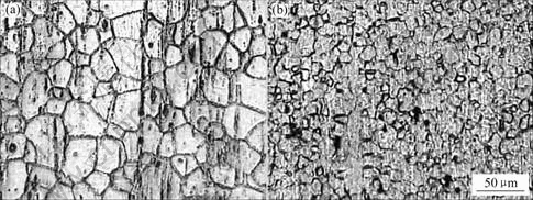 The microstructures of two alloys after hot extrusion at 400 ℃ are shown in Fig.3. The dynamic re-crystallization of two alloys has completely taken place and the grains are fine, but it can be obviously found that the average size of MgGd grains is much bigger than that of MgGdScMn. The average size of MgGd grain is about 24 μm and that of MgGdScMn is about 8 μm.