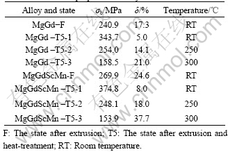 The tensile tests of the two alloys after hot-extrusion and hot extrusion plus heat treatment were carried out at room and high temperatures. The ultimate tensile strength and elongation at room temperature are increased by adding Sc and Mn in MgGd alloy, the elongation at high temperature also increases. The results are shown in Table 1. And sample in T5 state (at 200 ℃ for 78 h) is peak-aging.