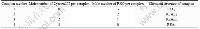 These corresponded data and some other elemental results are shown in Table 1. From Table 1, it can be seen that the molar ratio of rare earth to extractant is 1?3.10, close to 1?3. This means that the saturation method can be used to identify the molar ratio of rare earth to extractant, however, it cannot be used to solve the problems about the detailed structure of the extraction complex. The reason is that different relative amount of the substance between Cyanex272 and P507 would result in different chemical structures for the complex. Here, four kinds of extraction complexes with different structures are listed in Table 2.