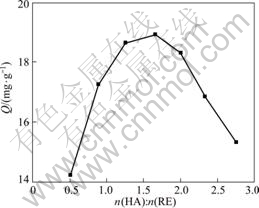 Fig.2 Adsortion capacity Q changed with extraction ratio of HA to RE with mole number of HL fixed