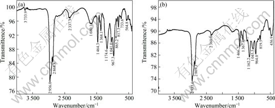 Comparing with spectra in Fig.8, we can see a slight shift of O—H stretching vibration from 2 365.3 cm-1 in Fig.8(a) to 2 360.8 cm-1 in Fig.8(b), while there is no shift occurred for P=O band. This infers that rare earth ions have replaced H+ in O—H hydroxyl but did not coordinate with P=O ligand, which indicates H+ ions in synergistic extractant have all been replaced by RE3+.