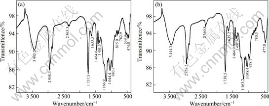 Fig.8 shows the IR spectra of Cyanex272-P507 inpregnated resin before and after extracting rare earth. Different from Fig.6, there is no characteristic absorption peak of O—H hydroxyl around 2 750-2 600 cm-1 (in Fig.8(a)), indicating that the extractant in Cyanex272- P507 impregnated resin is in a form of monomer.