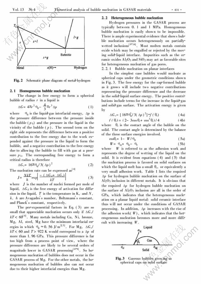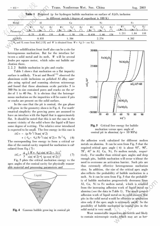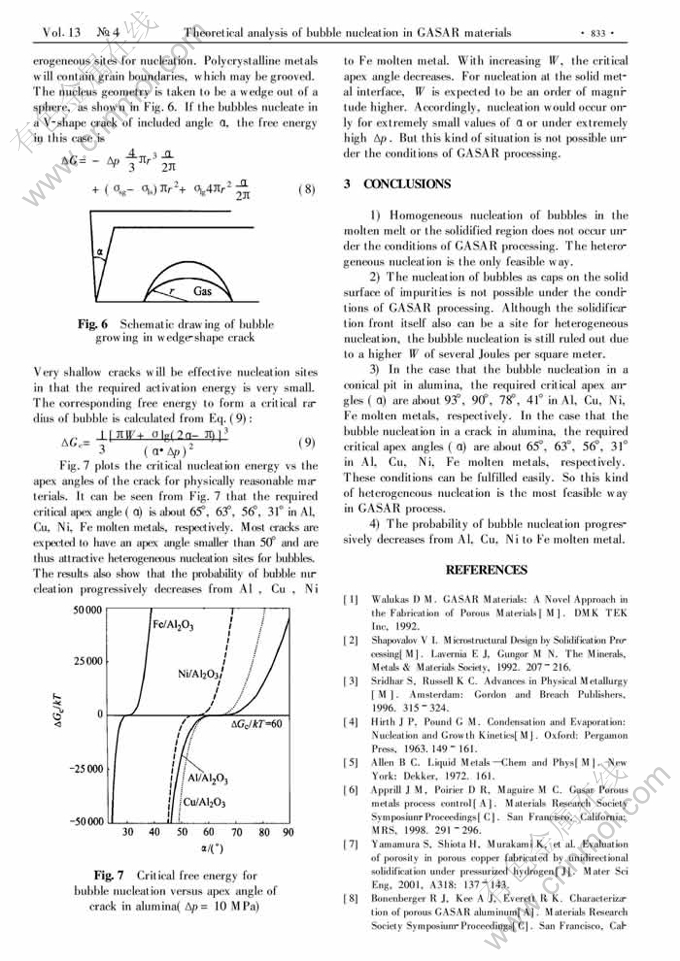 Abstract: Nucleation of gaseous hydrogen bubbles is the initial stage of GASAR process. Through the theoretical analysis, it has been identified that heterogeneous nucleation of bubbles as caps on the solid surfaces of impurities is impossible and only the heterogeneous nucleation in pits and cracks in impurities is the most feasible way in the GASAR process. The results also show that the probability of bubble nucleation progressively decreases from Al, Cu and Ni to Fe molten metal, which is the result of the increasing adhesion work of liquid metal on alumina.