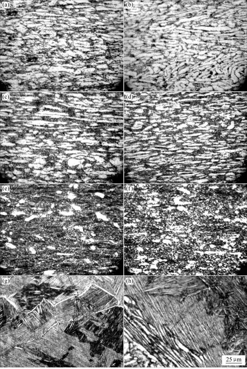 Fig.1 Microstructures of TA15 titanium alloy deformed at different conditions: (a) 850 ℃, 0.3 mm/s; (b) 850 ℃, 0.1 mm/s; (c) 925 ℃, 0.3 mm/s; (d) 925 ℃, 0.1 mm/s; (e) 960 ℃, 0.3 mm/s; (f) 960 ℃, 0.1 mm/s; (g) 1 050 ℃, 0.3 mm/s; (h) 1 050 ℃, 0.1 mm/s