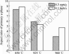 With the variation of volume fraction and size, the aspect ratio of primary α phase changes too. Hot deformation can cause globularization of the microstructure through segmentation of the alpha lamellae by process such as boundary splitting and edge spheroidization[9-10]. The globularization is more apparent at higher temperature. So the aspect ratio of primary α phase decreases with the increase of deformation temperature. The effect of deformation temperature and deformation speed on the aspect ratio is shown in Fig.4. When the deformation speed is 0.1 mm/s, not only the primary α phase but also the secondary α phase is spheroidized (Fig.1(f)).
