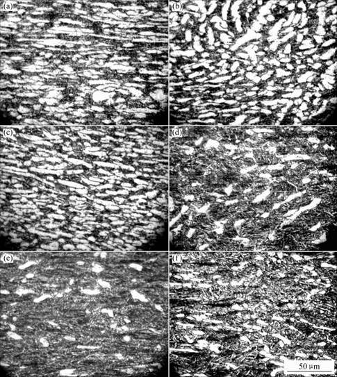 Fig.5 Microstructures of TA15 alloy deformed at different deformation degrees and temperatures: (a) 925 ℃, 40%; (b) 925 ℃, 60%; (c) 925 ℃, 80%; (d) 960 ℃, 40%; (e) 960 ℃, 60%; (f) 960 ℃, 80%