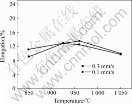 The effects of deformation conditions on the elongation are shown in Figs.8 and 9. The tensile strength under deformation speed 0.1 mm/s is a little higher than that under 0.3 mm/s. This may be related to the spheroidized secondary α phase in the transformed β. It can be seen that the elongation is maximum up to 13.5% when the deformation temperature is 960 ℃ and the deformation speed is 0.1 mm/s. The elongation at 1 050 ℃ is relatively low because of Widmanstaten structure.