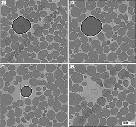 Fig.8 Sequence of 2-D images extracted from volume of Al-13%Cu alloy showing evolution of a pore during holding of alloy in semi-solid state: (a) t=13.3 min; (b) t=27.6 min; (c) t=41.8 min; (d) t=56.1 min