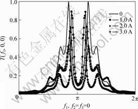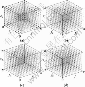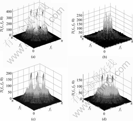 Fig.4 2-slices of trispectrum: (a) TSAR(f1, f2, 0) of I=0 A; (b) TSAR(f1, f2, 0) of I=1.0 A; (c) TSAR(f1, f2, 0) of I=2.0 A; (d) TSAR(f1, f2, 0) of I=3.0 A