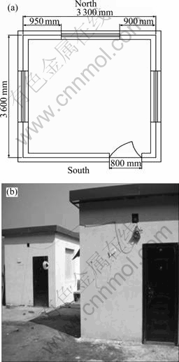 Two experimental cubicles were constructed and located on the roof of a three-storey building at building environment experiment center of Chongqing University, China. The reference cubicle envelope consisted of solid clay brick and single glass, both of them were common residential building envelope in the 1980s and 1990s. The other was called energy saving cubicle, whose envelope consisted of hollow brick with external insulation and insulating glass. The insulation material was 30 mm of thick polystyrene plastic extrusion plate (XPS). Both cubicles (3.6 m×3.3 m×3 m) had the same roof and floor structure and face south (Fig. 1). Thermal parameter and structure of envelopes can be gotten from Ref. [12]. There was an opening (165 mm×165 mm) that was at the height of 2.4 m on the south and north wall of each cubicle. The south opening had a ventilator and the north had an exhaust opening. Ventilation volume of ventilator could be controlled by the voltage regulator. The gap around the ventilator was sealed by sealants.