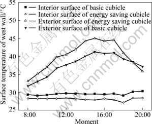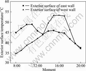 In Fig. 3, measured exterior surface temperature of wall in the direction of west and east for energy saving cubicle on August 10th in Chongqing is shown. This day is sunny. The moment when the outer surface temperature of east wall reaches its maximum temperature is about 11:00 and that of west wall is about 16:00. The exterior surface maximum temperature of east wall is lower than that of west wall. It is seen from Fig. 3 that the temperature has an intersection at about 13:00 pm between exterior surface of east wall and west wall. Exterior surface temperature of east wall is higher than that of west wall before 13:00, but it is contrary after the intersection (13:00). This could be explained by the fact that the rule of the sun rises and falls and the intensity difference of the solar radiation. Both of them lead to the exterior surface maximum temperature of east wall and west wall and the moments when the temperature reaches the maximum are different. This experimental result is in agreement with the simulated result of Ref. [13] about the comparison between exterior surface temperature of east wall and west wall in different directions. This indirectly verifies the correctness of the simulated results of Visual DOE4.0 software.