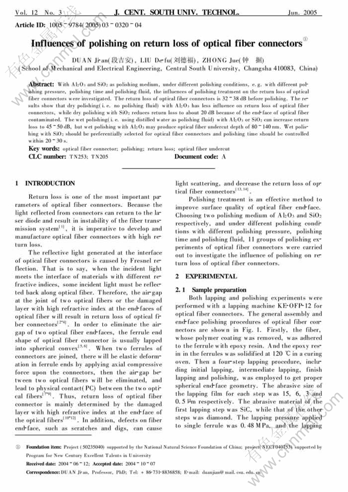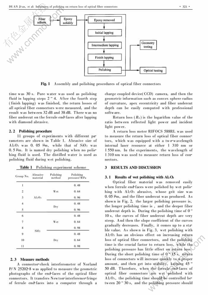 Key words:optical fiber connector; polishing; return loss; optical fiber undercut