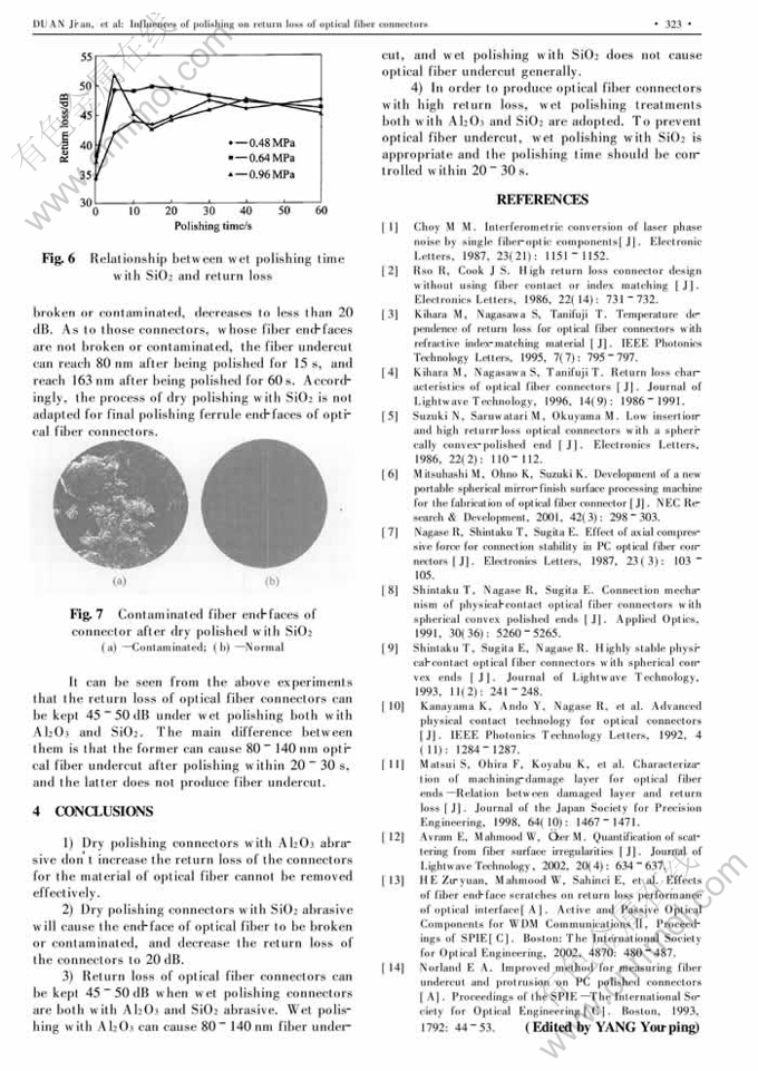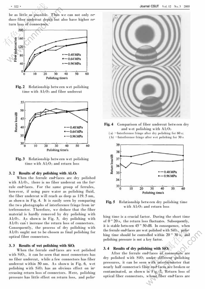 Abstract: With Al2O3and SiO2as polishing medium, under different polishing conditions, e.g. with different polishing pressure, polishing time and polishing fluid, the influences of polishing treatment on the return loss of optical fiber connectors were investigated. The return loss of optical fiber connectors is 32 38 dB before polishing. The results show that dry polishing(i.e. no polishing fluid) with Al2O3 has less influence on return loss of optical fiber connectors, while dry polishing with SiO2reduces return loss to about 20 dB because of the end-face of optical fiber contaminated. The wet polishing(i.e. using distilled water as polishing fluid) with Al2O3 or SiO2can increase return loss to 45 50 dB, but wet polishing with Al2O3 may produce optical fiber undercut depth of 80 140 nm. Wet polishing with SiO2 should be preferentially selected for optical fiber connectors and polishing time should be controlled within 20 30 s.