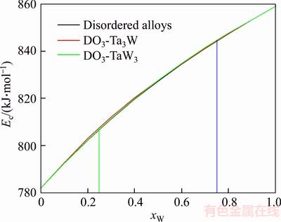 Figure 6 Cohesive energies of disordered Ta1–xWx alloys, DO3-Ta3W and DO3-TaW3 ordered alloys as functions of composition xW