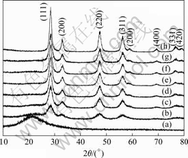 Fig.1 XRD patterns of samples with different coating amounts: (a) Pure SiO2; (b) 20%; (c) 40%; (d) 60%; (e) 80%; (f) 100%; (g) 150%; (h) Pure CeO2