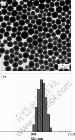 所制备SiO2粉体的TEM像和粒度分布如图2所示。从样品的TEM像可以看出,所制备的SiO2颗粒呈球形,粒径在150~180 nm左右,分散性良好。而且从粒度分布曲线也可以看出,样品的粒度分布很窄,通过纳米激光粒度仪所测定的平均粒径为166.5 nm,与TEM像所观察到的颗粒大小基本一致。