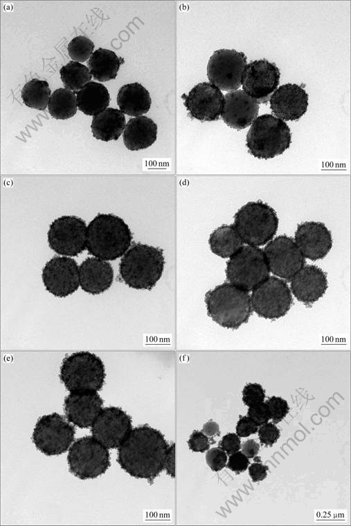 Fig.3 TEM images of CeO2-coated SiO2 nanoparticles with different coating amounts: (a) 20%; (b) 40%; (c) 60%; (d) 80%; (e) 100%; (f) 150%