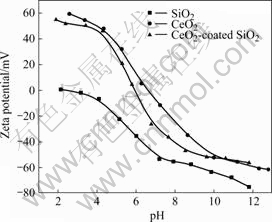 图4所示为纯SiO2、CeO2/SiO2复合粉体(包覆量为80%)以及纯CeO2的Zeta电位随pH的变化曲线。由图4可以看出,纯SiO2、CeO2/SiO2复合粉体以及纯CeO2的等电点(IEP)分别在2.4、6.2和6.8附近,包覆粉体的等电点明显地从纯SiO2偏向纯CeO2。这也表明,复合粉体的包覆并不是完全致密的,或者说包覆粉体中的SiO2内核表面仍然对表面CeO2颗粒的Zeta电位产生影响[5]。