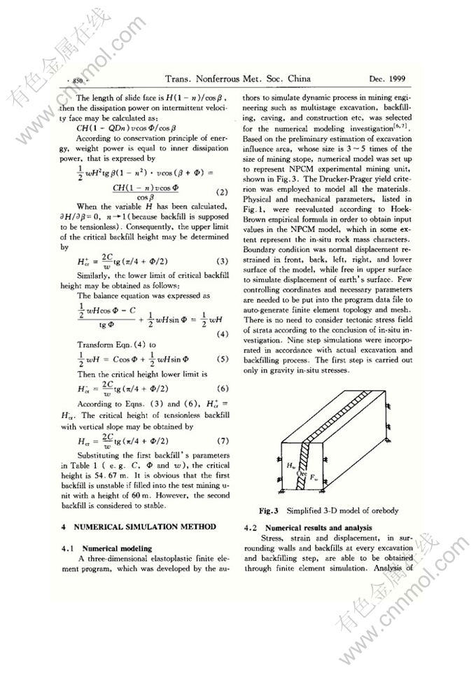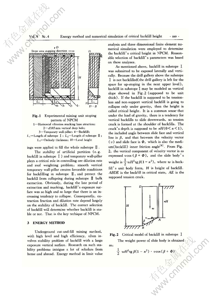 Abstract: Non-pillar continuous mining(NPCM) is regarded as a high-efficient, high-level and one-step mining technology, which can be divided into two substopes. Back fill stability status in substope I, which directly influence the loss rate and dilution rate, etc, will determine whether the experimental research is successful or not. By employing energy method of limit analysis and finite element numerical simulation method, the critical backfill height was determined under the prerequisite condition of its stability, which put forward theoretical basis for reasonable and correct selection of backfill's parameters. The result showed that the first backfill could not keep stable for NPCM, while the other was able to.