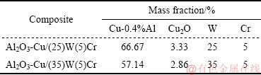 实验所用原材料为粒径2~5 μm的Cu-0.4%Al合金粉(质量分数),平均粒径44 μm的Cr粉和平均粒径为5 μm的W粉,采用粒径2~5 μm的Cu2O粉作为氧源。复合材料成分配比如表1所列,经充分混合后在ZMY-50-15型真空钼丝热压烧结炉中进行烧结,工艺参数为:真空度3~4 Pa,升温速率10 ℃/min,升温至650 ℃时加压15 MPa,保压1 h后卸压;继续升温至950 ℃后开始保温,1h后随炉冷却,温度降至100 ℃时取出试样。