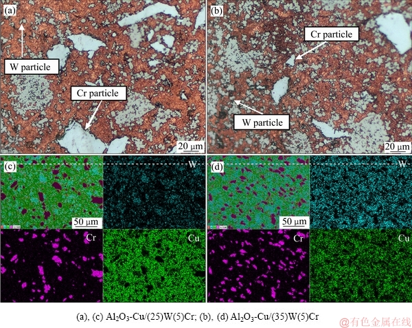 Fig. 1 Optical images((a), (b)) and EDS layered graph((c), (d)) of Al2O3-Cu/(W, Cr) composites