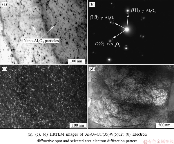 Al2O3-Cu/(35)W(5)Cr触头材料的TEM像如图2所示。由图2(a)可见,纳米Al2O3颗粒弥散分布在铜基体上,Al2O3颗粒钉扎位错并引起了位错塞积,从而起到弥散强化的作用,使触头材料的高温性能得到提高。