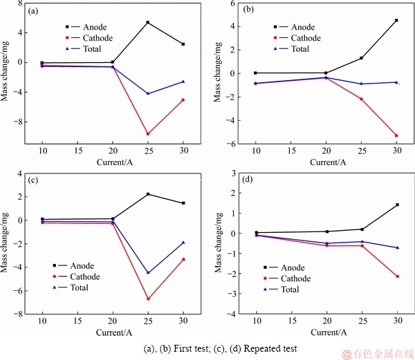 Fig. 3 Relationship between contacts material mass change and current of Al2O3-Cu/(25)W(5)Cr((a), (c)) and Al2O3-Cu/ (35)W(5)Cr((b), (d))