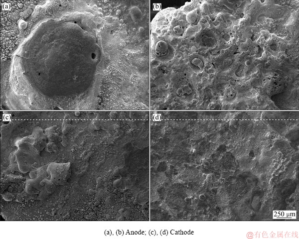 3) 两种触头材料在电弧侵蚀后形成了凸起、凹坑、针状结构和珊瑚状组织等典型的电弧侵蚀形貌;当W的含量由25%增加至35%时,阴极表面更加平整,凹坑变少。