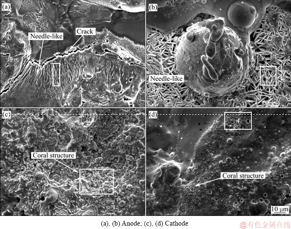 在DC(30 V,30 A)试验条件下电弧对两种触头材料的阳极和阴极的侵蚀形貌的高倍电镜照片如图5所示。在触头表面形成了液滴、针状结构、凹坑和凸起等典型的电弧侵蚀形貌。对图5高倍电镜下的侵蚀形貌中局部微区进行能谱成分(EDS)分析,数据如表3所列。